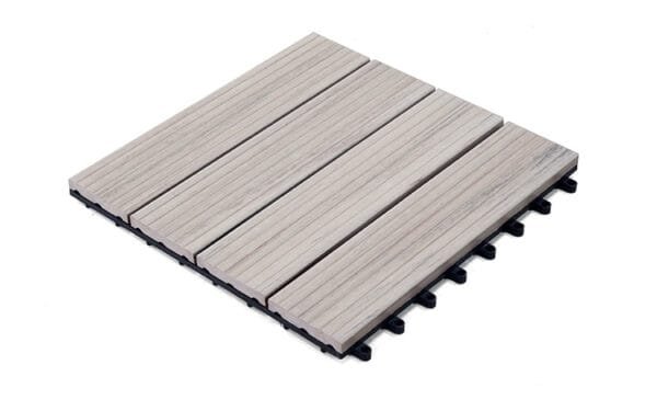 WPC tile slats permit water to flow through, while plastic feet elevate for drying airflow.